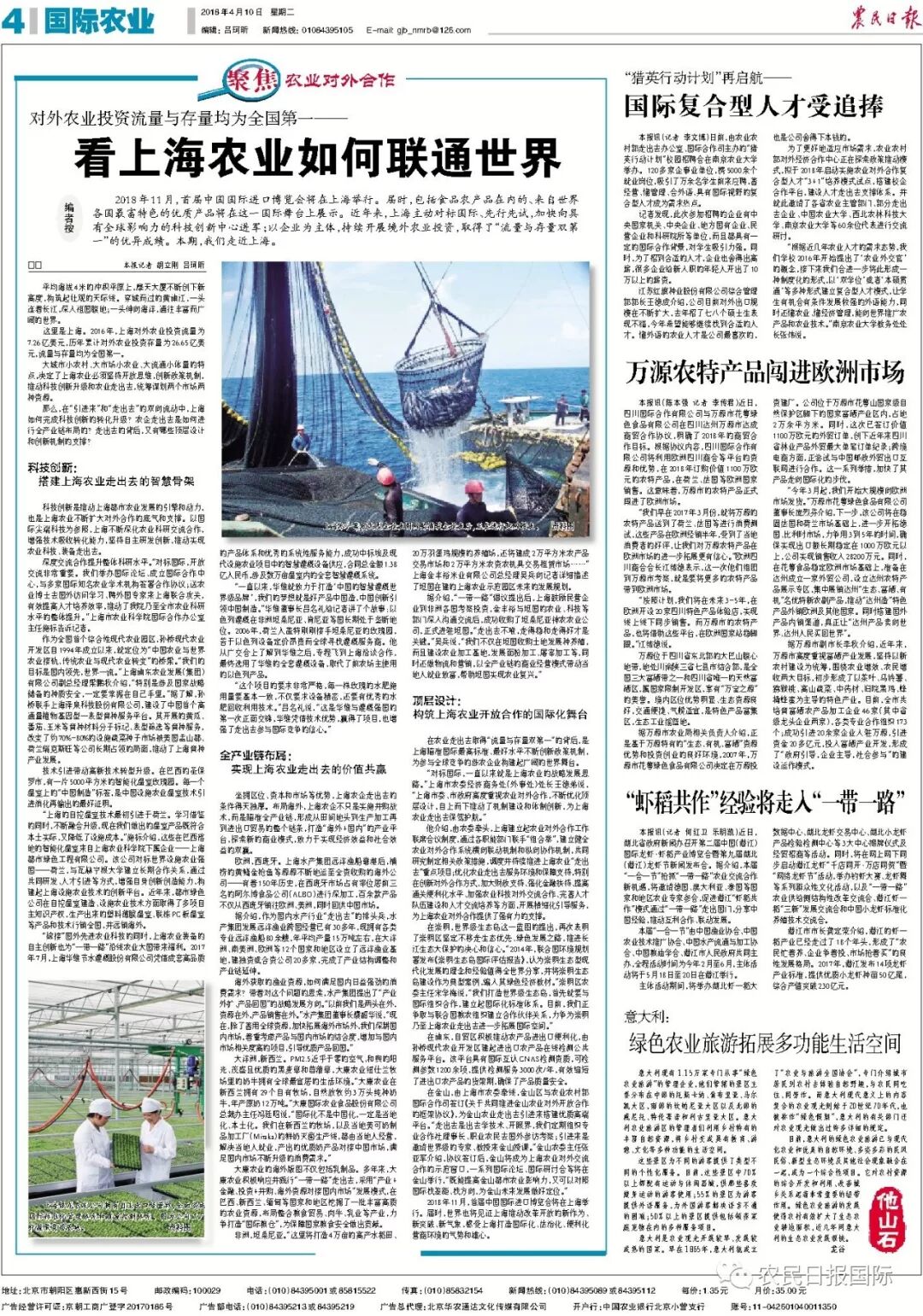 他介绍,由农委牵头,上海建立起农业对外合作工作联席会议制度,通过各职能部门联手“组合拳”,建立健全农业对外合作系统横向联动机制和纵向协作机制,共同研究制定相关政策措施,调度并持续推进上海农业“走出去”重点项目;优化农业走出去服务环境和保障支持,特别在创新对外合作方式、加大财政支持、强化金融扶持、提高通关便利化水平、加强农业科技对外交流合作、完善人才队伍建设和人才交流培养等方面,开展精细化引导服务,为上海农业对外合作提供了强有力的支撑。